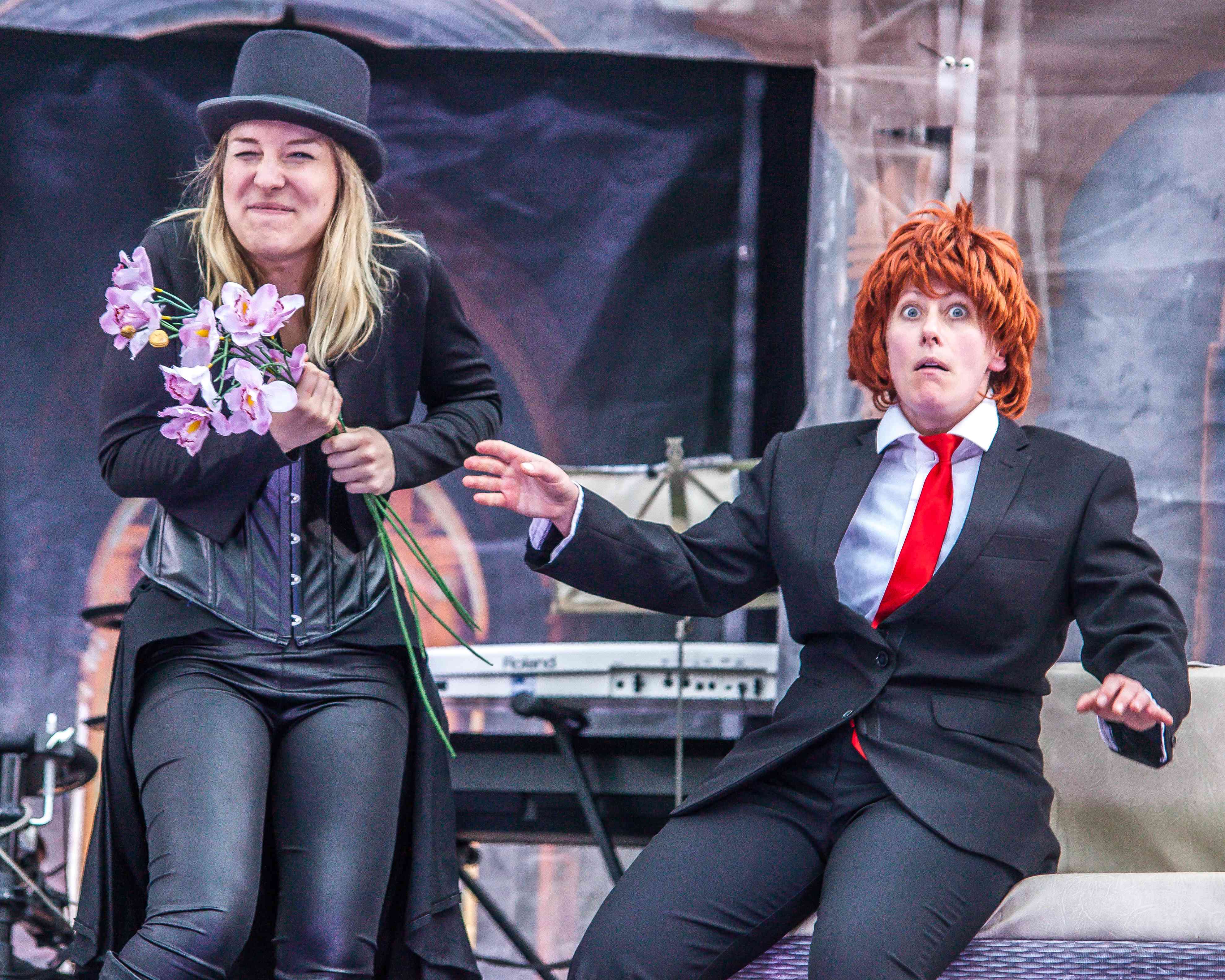 Led by director, and born showman, Andy Barrow, the cast basically just get up on stage and have a good time, dealing with whatever happens to come their way, whether or not it’s in the script. I particularly enjoyed the drunken antics of Sirs Toby Belch and Andrew Aguecheek (Kevin Kemp and Gavin Harrison), who spend much of their time giggling and falling over, and at one point wander into the audience in search of booze. And I may never be able to forget Malvolio (Andy Barrow) and his yellow stockings – for all the wrong reasons.