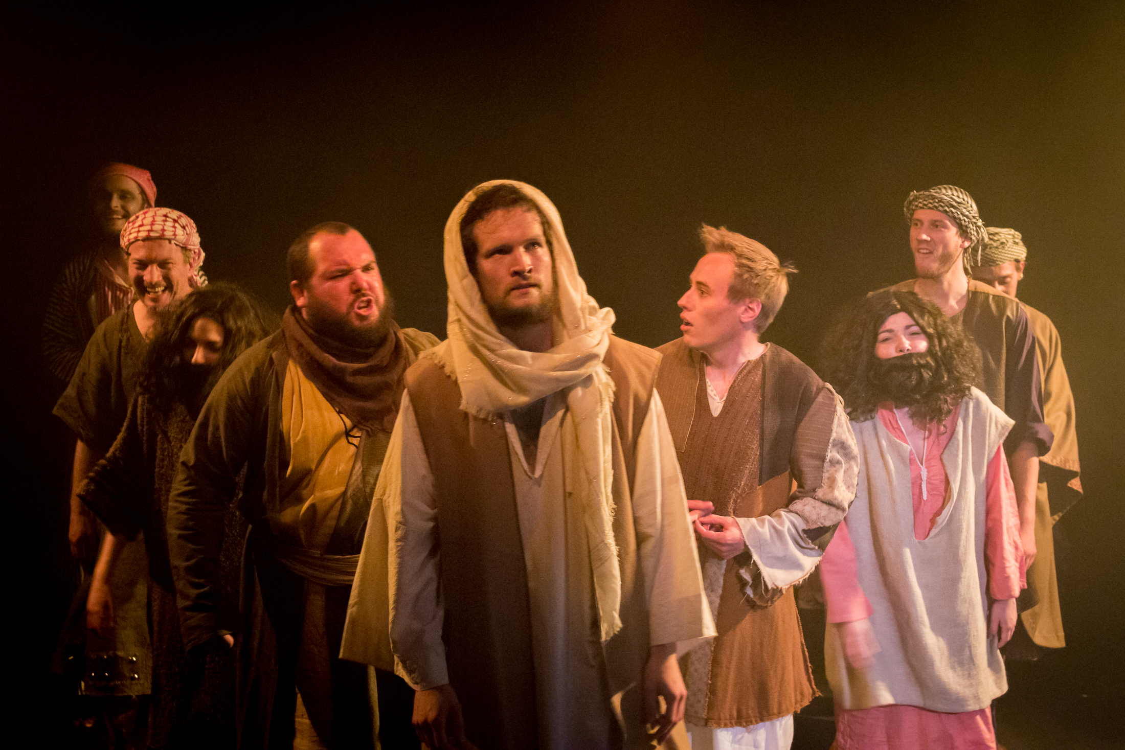 As in previous Arrows productions, every member of the cast excels, with most of them taking on multiple roles, and all proving themselves to be gifted comedians. Adam Elliott is full of charisma as bad boy Judas, while Elle Banstead Salim is a whirlwind of energy as feisty chatterbox Mary Magdalene (and also puts in a couple of fantastic cameos as a bride upstaged by Jesus at her own wedding, and Pontius Pilate’s Catherine Tate-inspired receptionist). Alex Stevens has perhaps the most challenging role as Paul, whose wildly homophobic language only thinly veils his private confusion and vulnerability. And then there’s Jesus, played by Pearce Sampson, master of the beatific smile, albeit often through gritted teeth, who grows increasingly frustrated as the disciples persist in asking awkward questions he can’t answer.