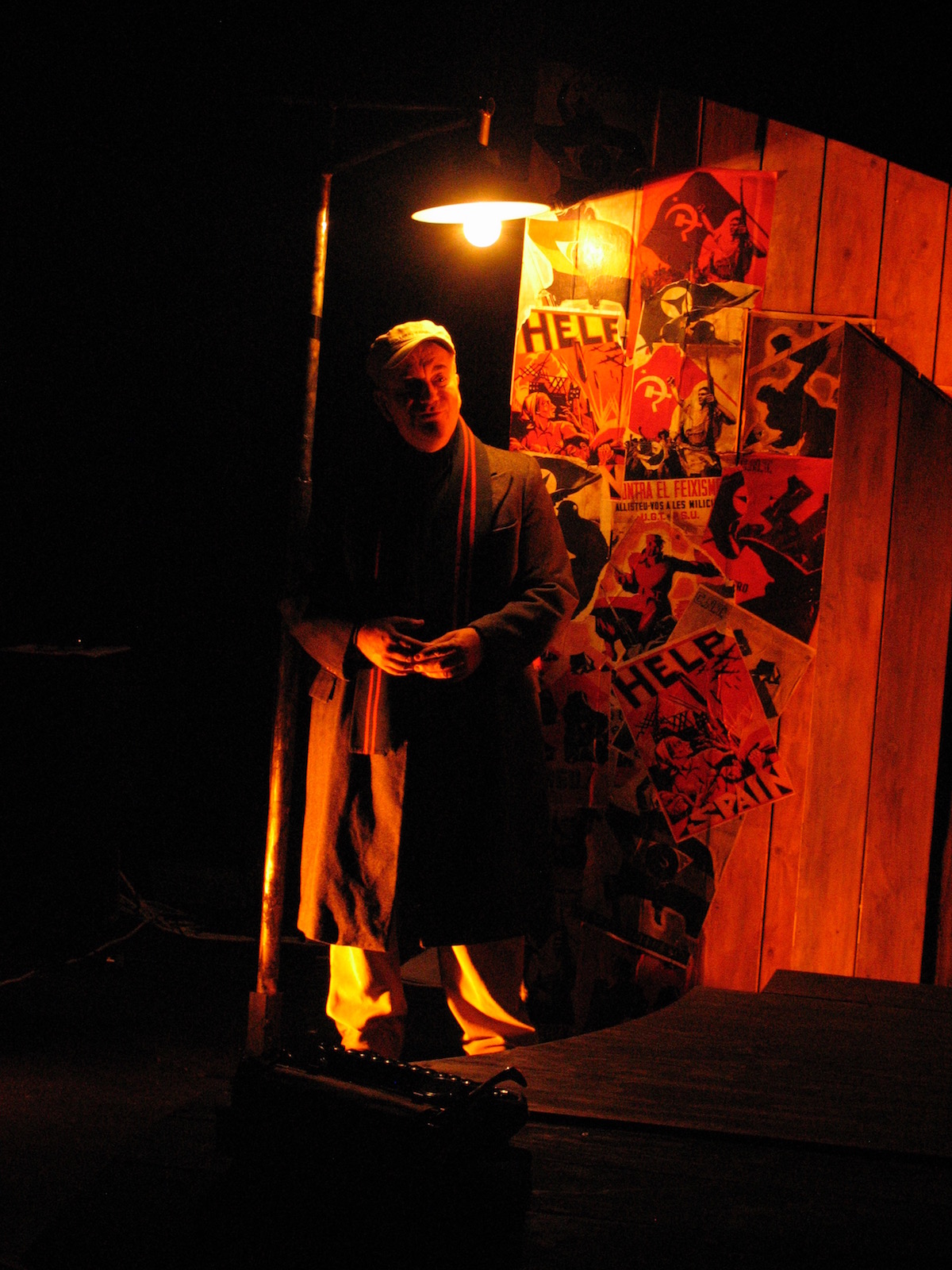 It’s a sobering tale, but told with an infectious charm and humour that means we come to really care for the characters. David Heywood oozes charisma as Clem, in a passionate performance that sees him mature before our eyes from cocky stunt rider, risking his life for thrills, to grim soldier taking on the dark forces of fascism. Alongside him, Neil Gore is a joy to watch as he fills all the other roles, from grumpy bosses to drunken Scotsmen, and – most importantly – the writer and intellectual Chris Caudwell. His unlikely friendship with Clem is the beating heart of Act 2, with each helping the other in moments of doubt, and the banter and political discourse between them is as entertaining as it is fascinating.