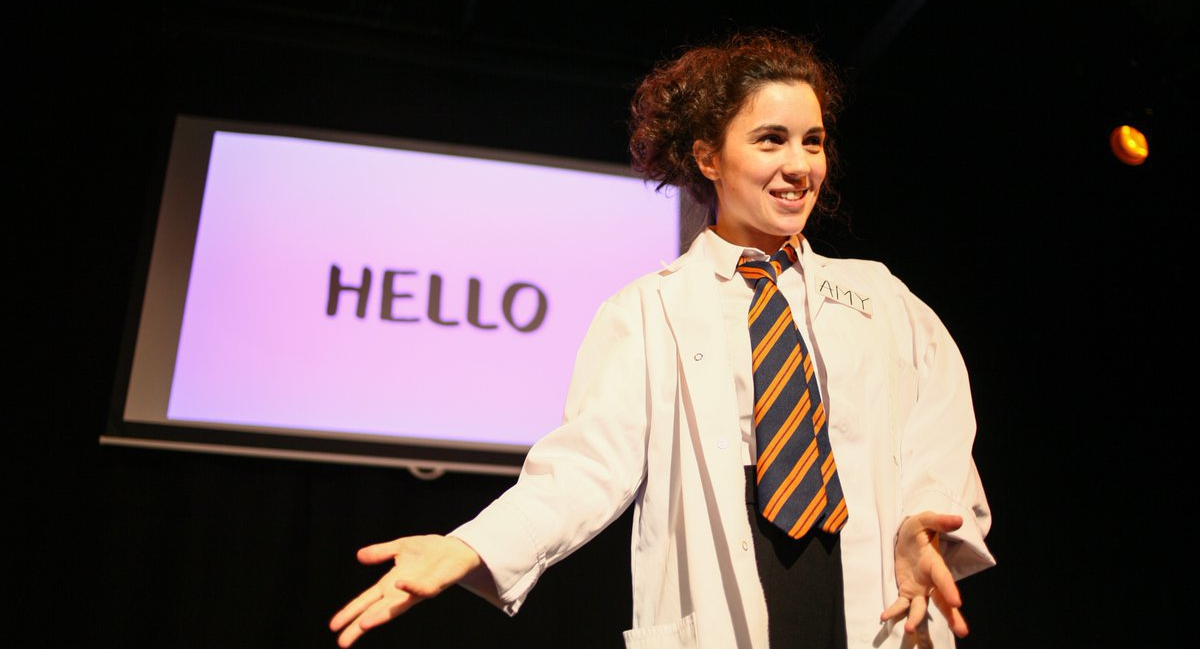 Directed by Roxy Cook, the action is indeed framed very much as a (slightly unconventional) lecture, with audio and visual aids on a projector screen to help illustrate the show’s anecdotes and theories. Meanwhile down on the ground, Amy bounces around the stage in her school uniform and a lab coat, vividly recreating events so that we’re totally drawn into her story and come to really care about what happens to her.