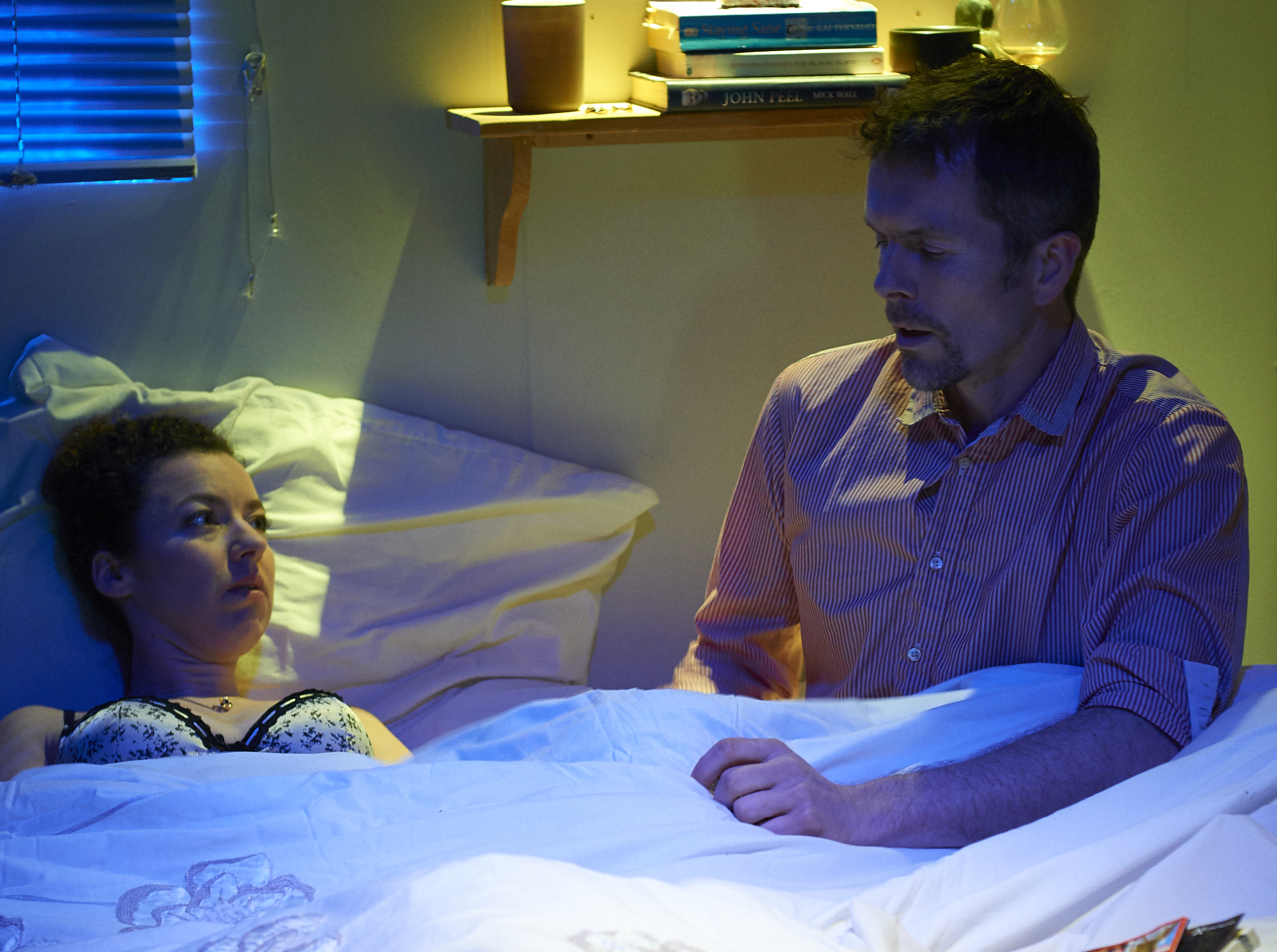 Unsurprisingly, their first encounter in ten years is not without a considerable amount of tension, and it takes us a while to get to the bottom of why Joanne’s actually here. She certainly doesn’t seem pleased to see Dave, poking around his rented Old Street studio apartment with an expression of bitter, sneering disdain, and resolutely refusing to be impressed despite all his bragging about plasma TVs and Sabatier knives. Dave in turn seems uncomfortable from the outset, filling every pause in the conversation with restless activity and irrelevant chatter, in a frantic effort to prove he’s made a success of his new life. It isn’t long before the simmering atmosphere – fuelled by ten years’ unresolved feelings of hurt, resentment, inadequacy and guilt – boils over, but while this threatens to derail the evening’s carefully laid plans, it also feels like a confrontation that’s long overdue, and that they both needed to have in order to move forward.