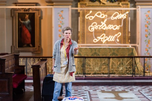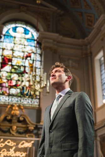 Directed by Gemma Kerr, the site-specific production takes full advantage of the unconventional setting, with the actors roaming all over the church (and occasionally climbing over audience members). This leads to a few awkward sight lines and occasional acoustic issues, particularly during Edward Lewis’ quietly charming musical numbers. But that’s a small price to pay to see the play performed in such a unique and visually stunning venue that really means something to the piece as a whole.