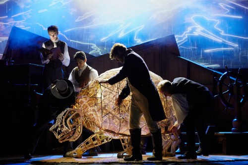 The production, written and directed by Dead Puppet Society’s David Morton, is jaw-droppingly beautiful in almost every way imaginable. A huge video screen projects vibrant animations depicting Darwin’s travels, while the majority of the action takes place on a huge revolve stage that doubles as both the ship’s deck and the rugged landscapes explored by the young naturalist. A gorgeous score from co-composers Lior and Tony Buchen transports us to new lands as a host of stunning puppets bring creatures great and small to life before our eyes.