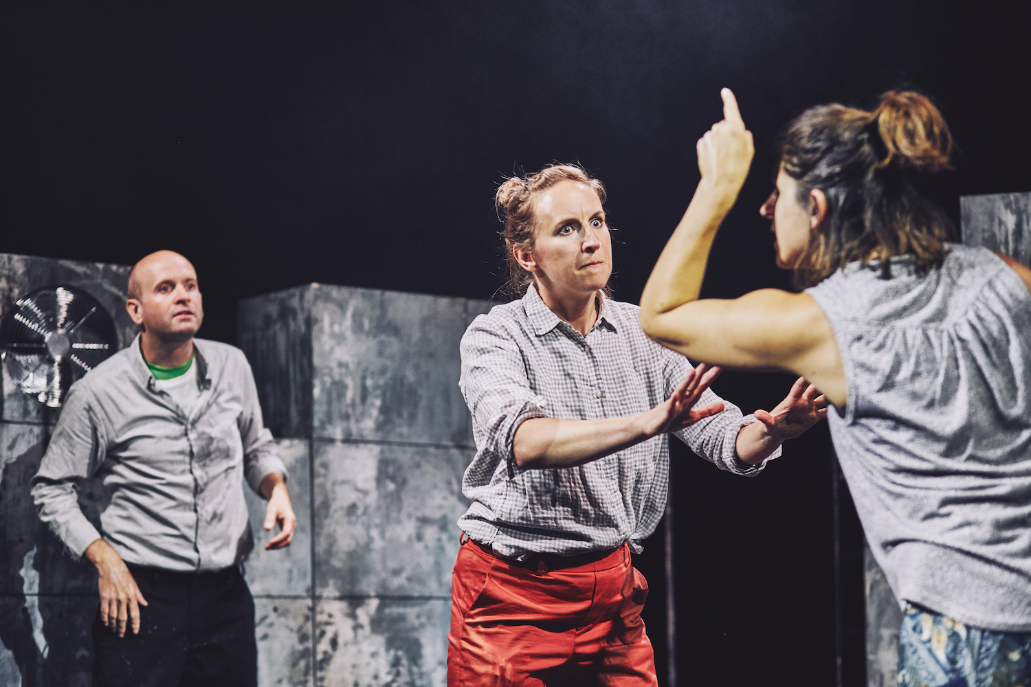 This is even more unsettling given that the clues are all there, long before the chainsaw comes out and everything turns to pandemonium. Live sidebar ads for everything from toothpaste to Christian Aid are slowly tweaked to complement the on-stage action. An emoji-riddled online conversation between Mia and Tim is spoken aloud, exposing the glaring lack of actual words used. And a number of scenes freeze, rewind and repeat several times with small tweaks – almost as if the actors are experimenting to see which version gets the best response…
