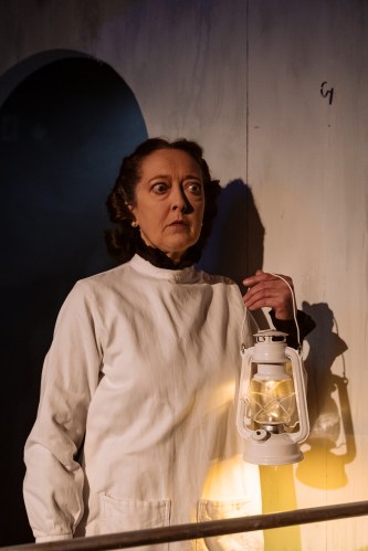 The premise of the play is already chilling enough, but director Kate Valentine’s production ramps up the creepiness to the point where you wonder how Hazzard could possibly have got away with it for so long. The design work by Emily Bestow (set and costumes), David Chilton (sound) and Ben Bull (lighting) is pure black and white horror movie: the sanitarium is dark and echoey, with flickering lights, ripped and stained curtains and sinister dripping noises. From the start, its owner has every appearance of being a fanatic, who makes up her patients’ room by pulling the beds out of the wall just like drawers in a morgue. Watching the Williamson sisters check in strongly resembles the moment in a movie when the unwitting victims enter the haunted house of their own free will, despite everyone in the audience willing them to run the other way. Throw in a power cut, a thunderstorm and something very bad waiting to be discovered in a bathtub, and you’ve got the makings of a very creepy play indeed.