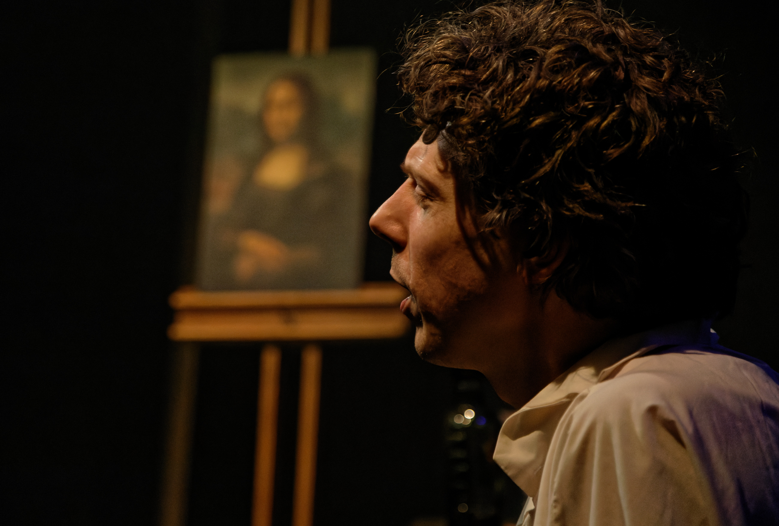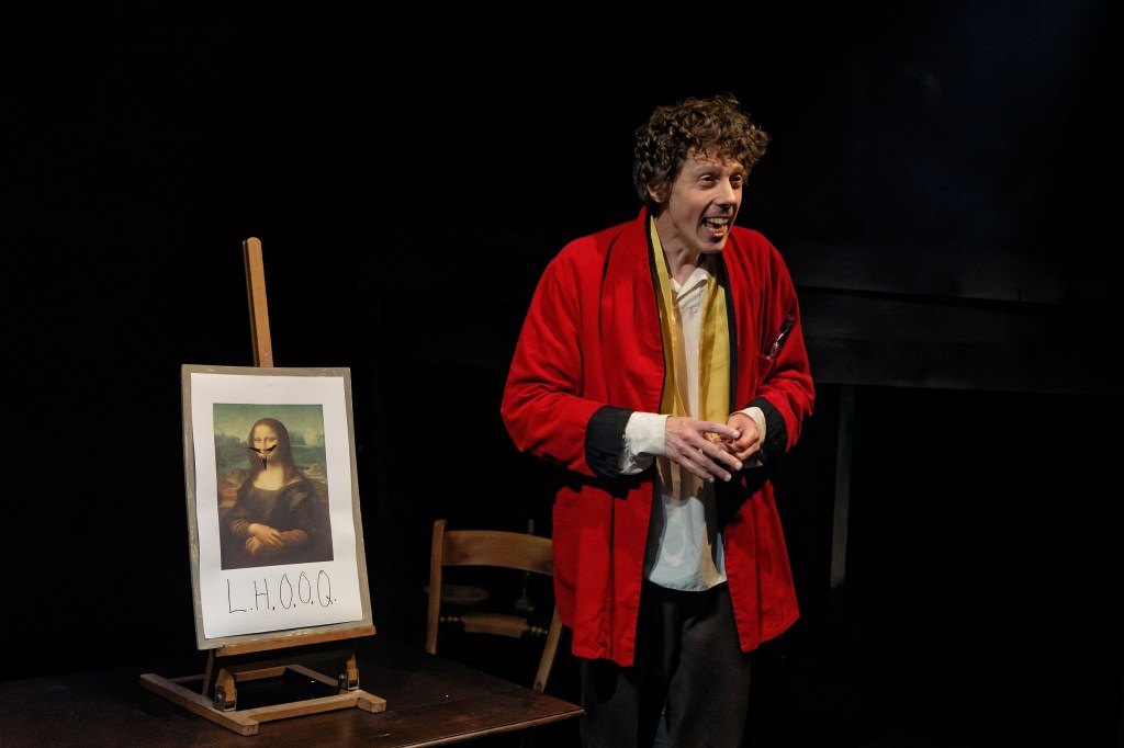 Peruggia’s response to the painting allows Lodato to expand his focus and allow other voices to offer their own perspectives on Da Vinci’s work. In all, there are ten characters in the play, and each of them is portrayed in Kate Bannister’s production by Tice Oakfield, who transforms before our eyes from Vincenzo Peruggia to artist Marcel Duchamps, to British critic Walter Pater, to a harried school teacher trying to get her kids to engage with art. By exploring these different viewpoints, Lodato invites the audience – at one point quite literally – to consider for ourselves this picture we’ve seen hundreds of times, and to ask anew just what it is about La Gioconda that provokes such passionate reactions in people from all walks of life.