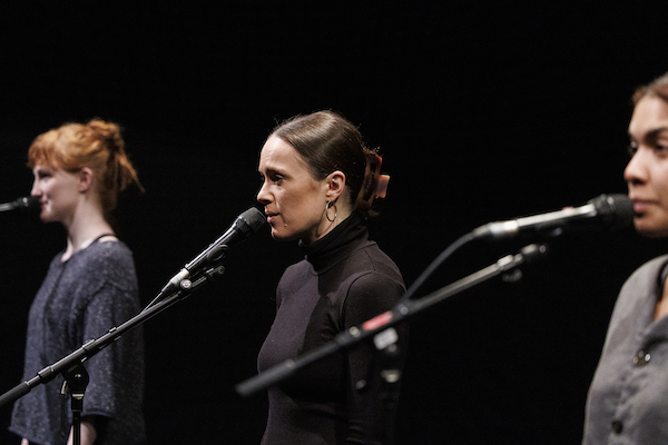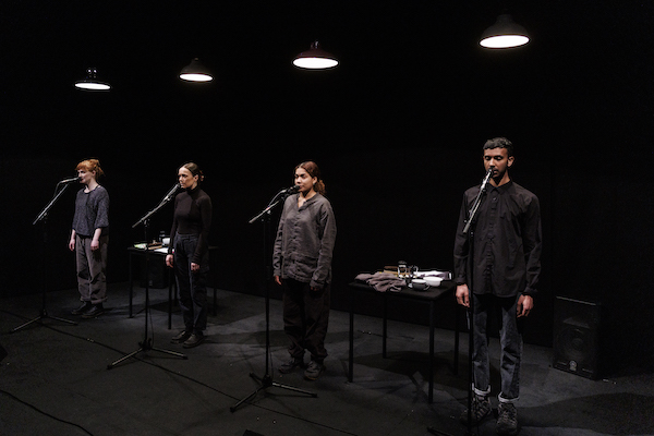 Much like its protagonist, Katie Mitchell’s production is much more complex than it initially appears to be. The actors each stand at a microphone against a plain set, each lit from above by a hanging lamp (with exquisitely subtle lighting design by Bethany Gupwell). And then they begin to speak, and not only the stage but the entire space comes alive as the main character’s internal and external worlds come together in a wall of sound that at times verges on overwhelming. In addition to the actors’ voices, Melanie Wilson’s sound design allows us to hear everyday life going on – traffic noise, the background hum of a working office – and also more intimate sounds, created by the actors through the use of on-stage props, like the brushing of teeth or the scratching of skin. It’s such a complete soundscape that the audience loses nothing at all by not seeing the action unfold; we have everything we need to each conjure up our own mind’s eye image.