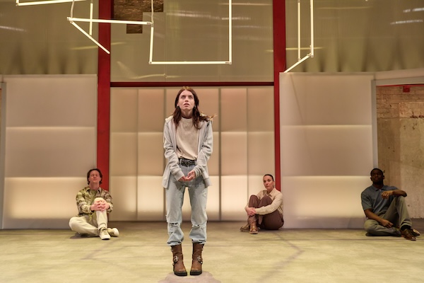 On an empty stage, against a generic city skyline, the three family members – joined by Tok Stephen in a number of roles – frequently stand at opposite corners, their physical distance from each other emphasising the gaping emotional chasm that separates them. We see glimpses of their former life, the typical brother-sister bickering between Tara’s two precocious children, and the bright potential both have in their respective areas of study. And in contrast, we see Connor angry and hurt in the aftermath of that 3am phone call, and Esme physically and mentally broken by her ordeal. Rosie Day is exceptional, her body language – hunched shoulders, arms hugging her midriff, lowered head – speaking perhaps even more clearly than she herself does about what she’s feeling.