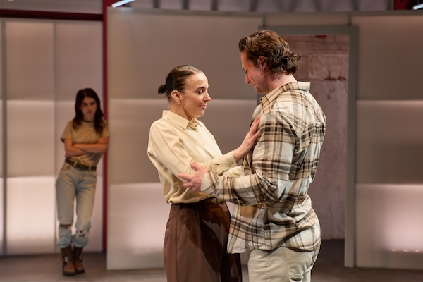 On an empty stage, against a generic city skyline, the three family members – joined by Tok Stephen in a number of roles – frequently stand at opposite corners, their physical distance from each other emphasising the gaping emotional chasm that separates them. We see glimpses of their former life, the typical brother-sister bickering between Tara’s two precocious children, and the bright potential both have in their respective areas of study. And in contrast, we see Connor angry and hurt in the aftermath of that 3am phone call, and Esme physically and mentally broken by her ordeal. Rosie Day is exceptional, her body language – hunched shoulders, arms hugging her midriff, lowered head – speaking perhaps even more clearly than she herself does about what she’s feeling.