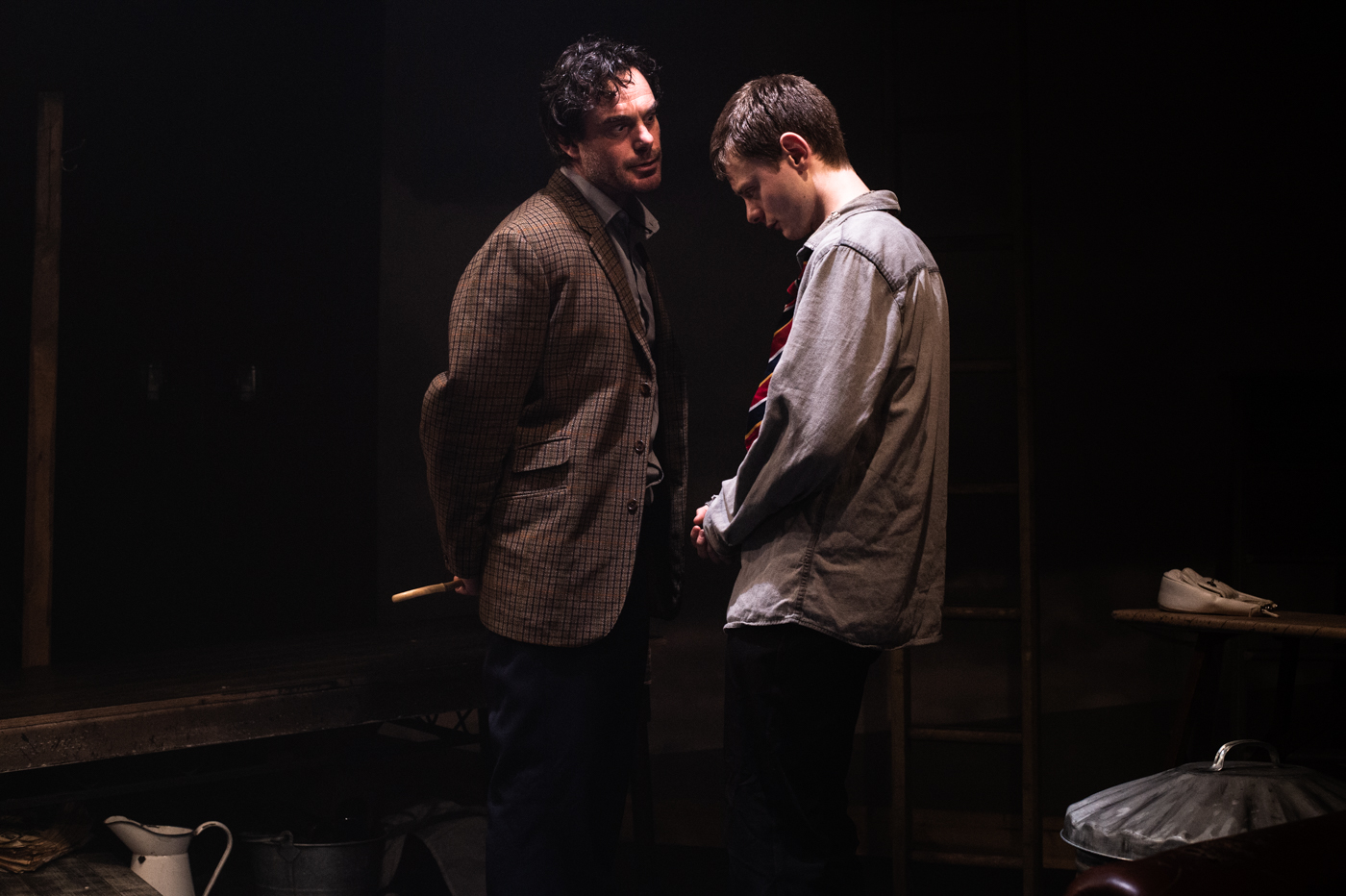 We never actually see Kes, obviously (bird of prey plus small pub theatre would probably be a bad idea; you certainly wouldn’t get me in there), but her presence is very powerfully felt, thanks to two spellbinding performances from Simon Stallard and Rob Pomfret, who both interact with the young kestrel as if she were right in front of them, and to some wonderfully evocative sound design by Jack Barton. And it’s not only the bird who’s conjured into life by the production’s design; Karl Swinyard’s set perfectly encapsulates each aspect of Billy’s uninspiring everyday world down at floor level, but opens up on higher ground – with the help of some beautiful lighting from Ben Jacobs – to reveal the vast rural landscape where Kes flies free. When she soars through the air, it’s not only Billy’s heart that lifts.