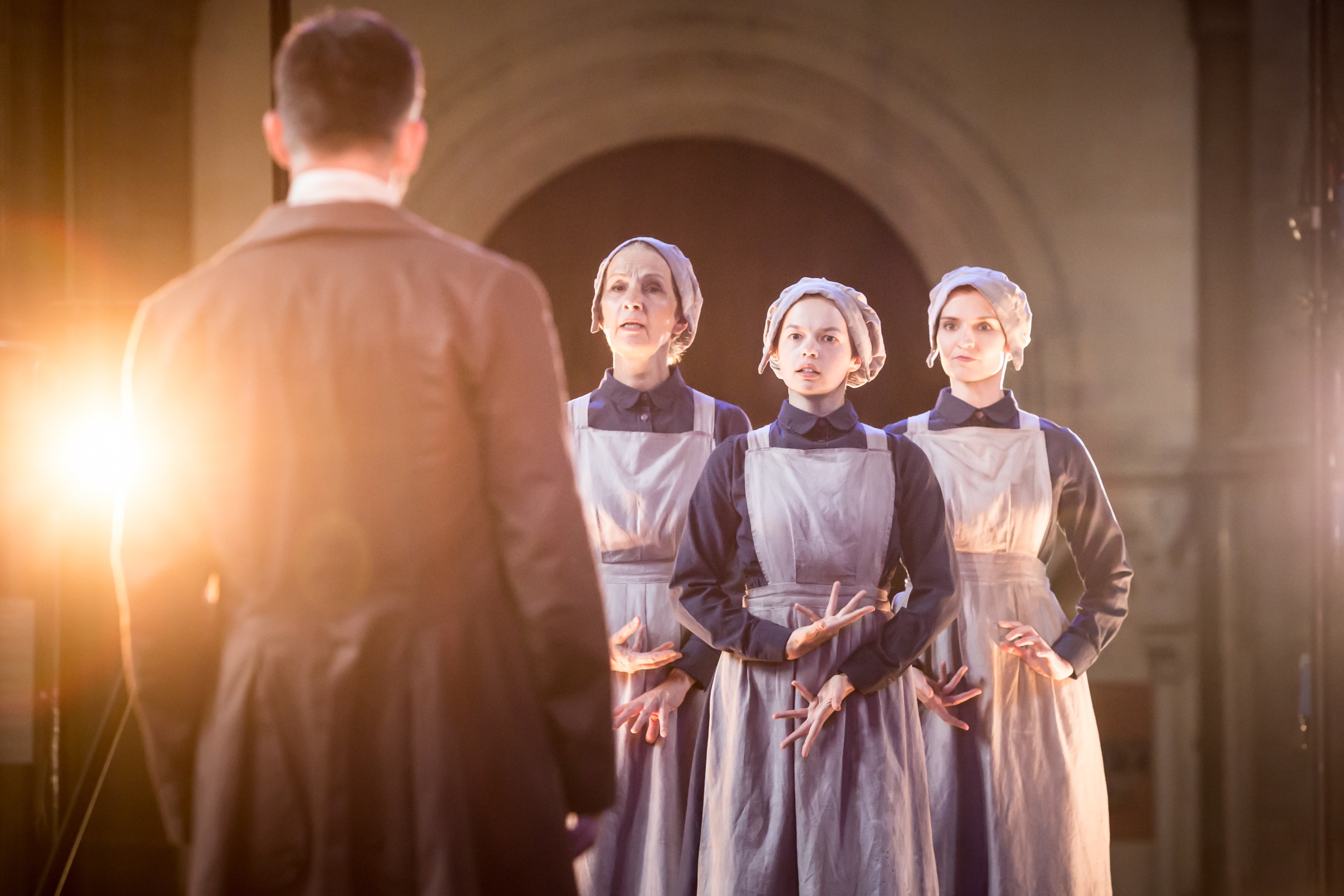 This naturally involves a bit of playing around with the original text, but the result is still a coherent, if incredibly brief, retelling of Hamlet’s story. The three performers are clearly enjoying themselves as they whisk us through the key events, dividing the principal roles and speeches between them, and filling in the inevitable gaps with puppetry and props. There are song and dance routines, overblown death scenes, and sword fighting without actual swords; Gertrude appears only as a floating head, and the murder of Gonzago is portrayed using toby jugs. Oh, and the dead king looks a lot like a fiercely grinning Brian Blessed.